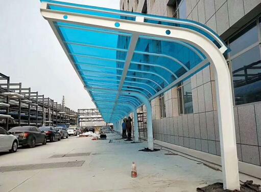 PC板雨棚 PC板遮陽棚案例 PC板廠家PC板雨棚具有照明性能好、使用壽命長(zhǎng)、外形美觀、噪音小、抗沖擊性強(qiáng)等優(yōu)點(diǎn)。PC板雨棚的優(yōu)點(diǎn)具體分析如下:采光性能:PC板雨棚采用高度透明的2mm——8mm PC板制成,透光率大于85%,透光率高。由于表面有紫外線涂層,因此具有抗紫外線功能。傳統(tǒng)的塑料雨棚是由劣質(zhì)塑料制成的,大多數(shù)都是不